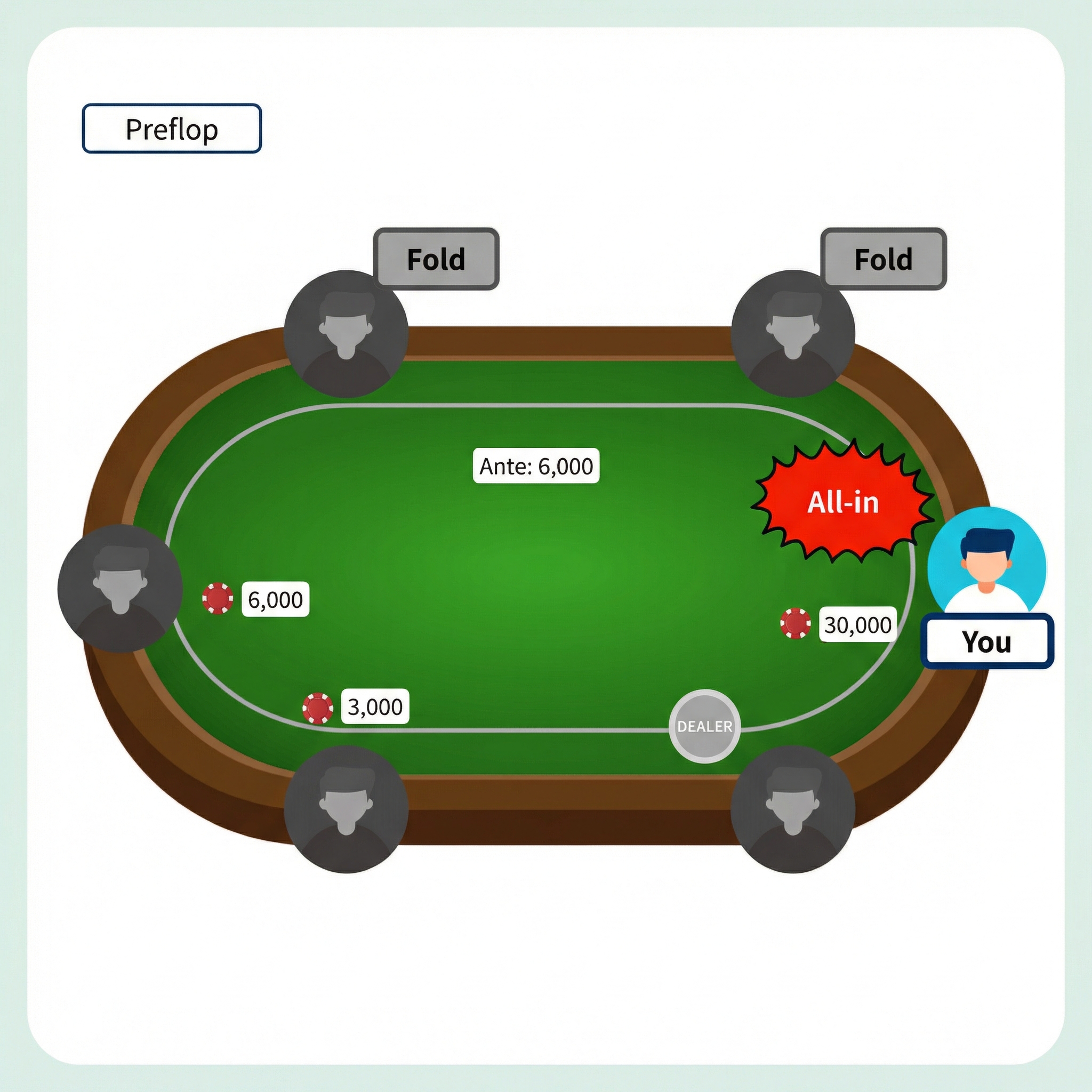 When stacks get shallow, your stack becomes relatively small compared to the pot. As a result, unlike deep-stack play, you need to go all-in much more often. If you fear elimination too much and hesitate to shove, you’ll miss profitable spots. Look for chances to apply pressure and get your chips in. Once you drop below 20bb, you should play with the possibility of open-shoving preflop in mind.