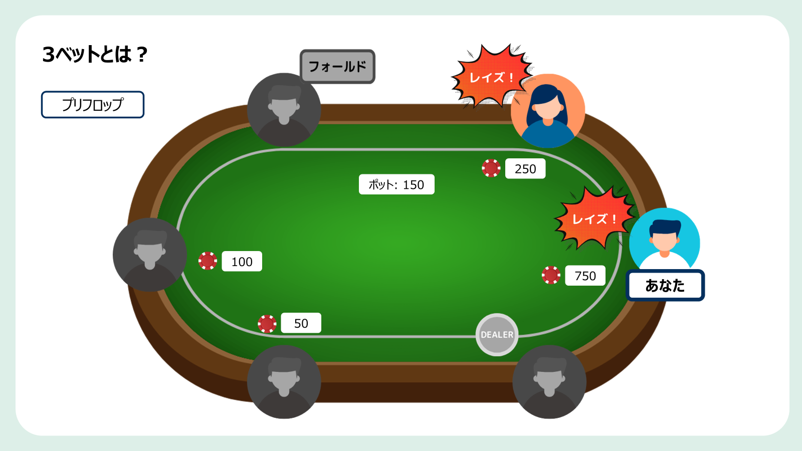 「3ベット」とは、主にプリフロップで相手のレイズに対し、2度目のレイズを返すことを指します。