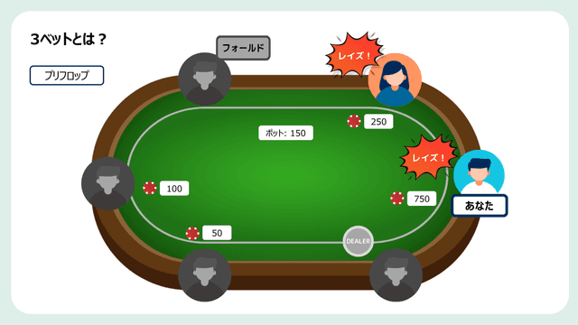 「3ベット」とは、主にで相手のに対し、2度目のを返すことを指します。