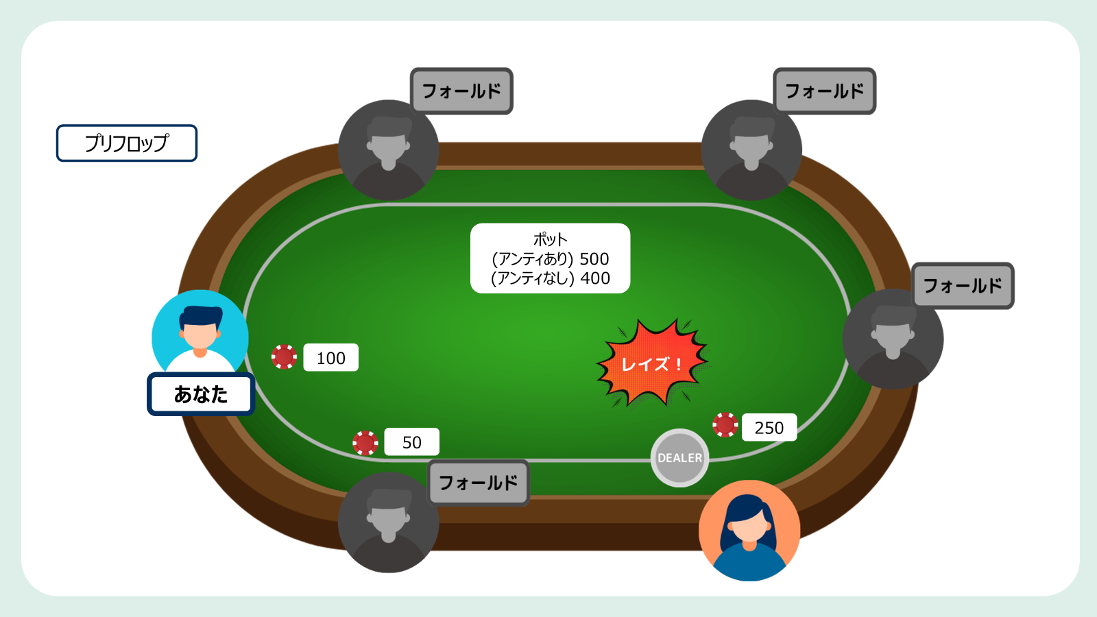 ここであなたがオープンレイズをして、SB・BBがどちらもフォールドした場合、あなたが得られるチップはアンティがなければ150点ですが、アンティがあれば250点にもなるのです。(アンティが合計100点の場合。以下同様)このように、プリフロップで全員を降ろしてブラインドとアンティを獲得する「スチール」がとても効果的なため、多くのハンドでオープンレイズをすることが出来るのです。特にあなたのオープンレイズに対してレイズを返してくるプレイヤーが少ない場合にはプリフロップで降ろされて払ったチップを失う可能性が低いため、積極的にオープンレイズをし、利益を増やしていきましょう。