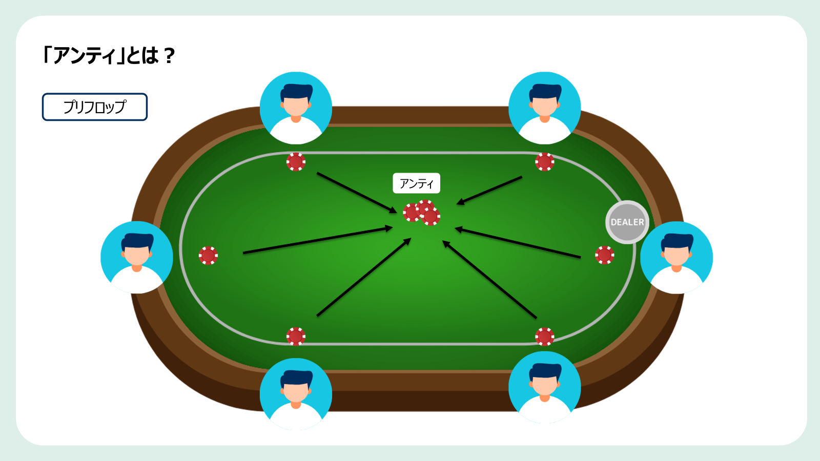 ポーカーの一般的なルールでは2人のプレイヤがスモールブラインド、ビッグブラインドという強制参加費を支払うことになります。このブラインドとは別に、最初からポットに加えられる強制参加費のことを「アンティ」といいます。元々はハンド毎にプレイヤー全員が同額を支払うというルールなのですが、ライブポーカーにおいては手間を減らすためにBBのプレイヤーがまとめて払うという「BBアンティ」が採用されることが多いです。
