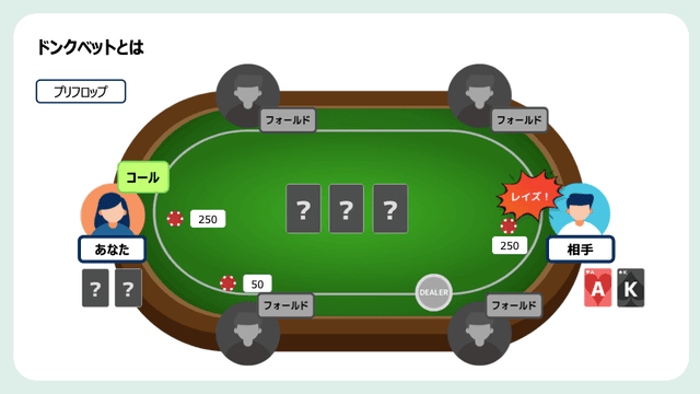 三人以上が参加しているシチュエーションで、もしフロップが開いた後に、全員がチェックで回してしまうと、相手に無償でドローを与えてしまうシチュエーションが発生します。そこでドンクベットをしておけば、相手がコールやレイズの選択を迫られ、タダでカードを見せないように誘導できるわけです。