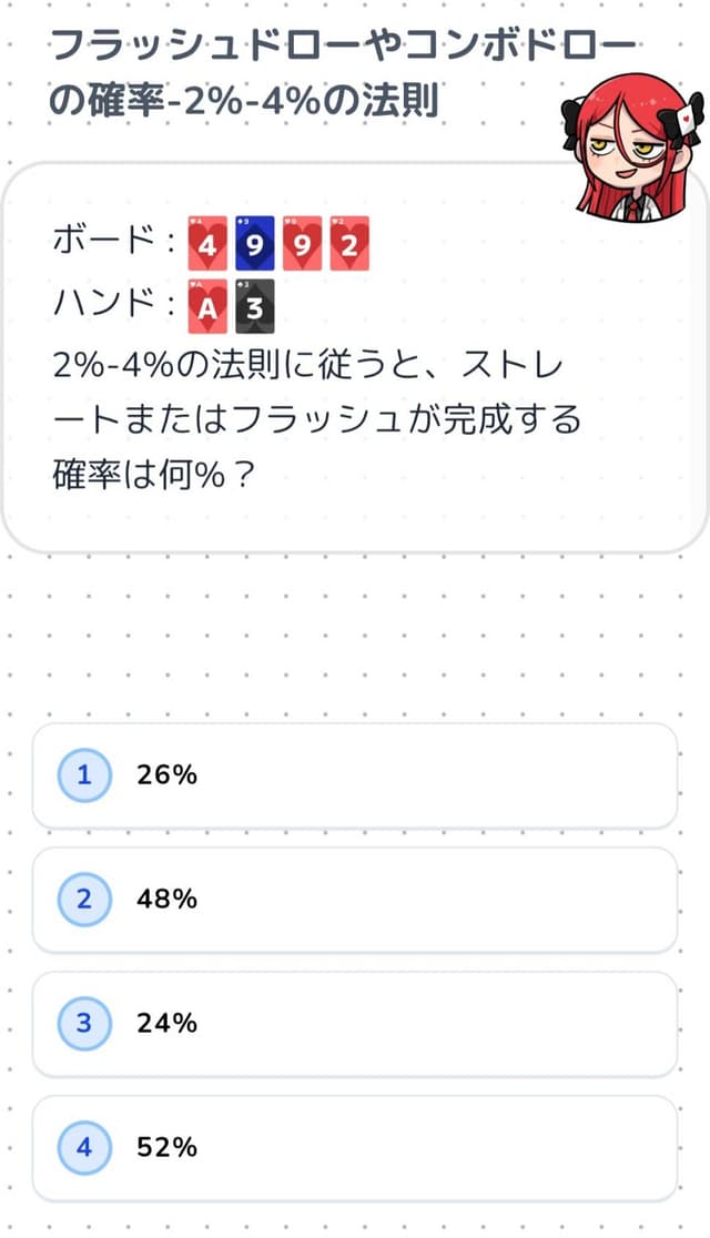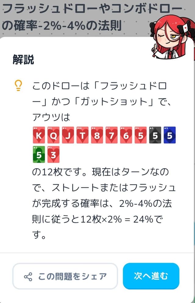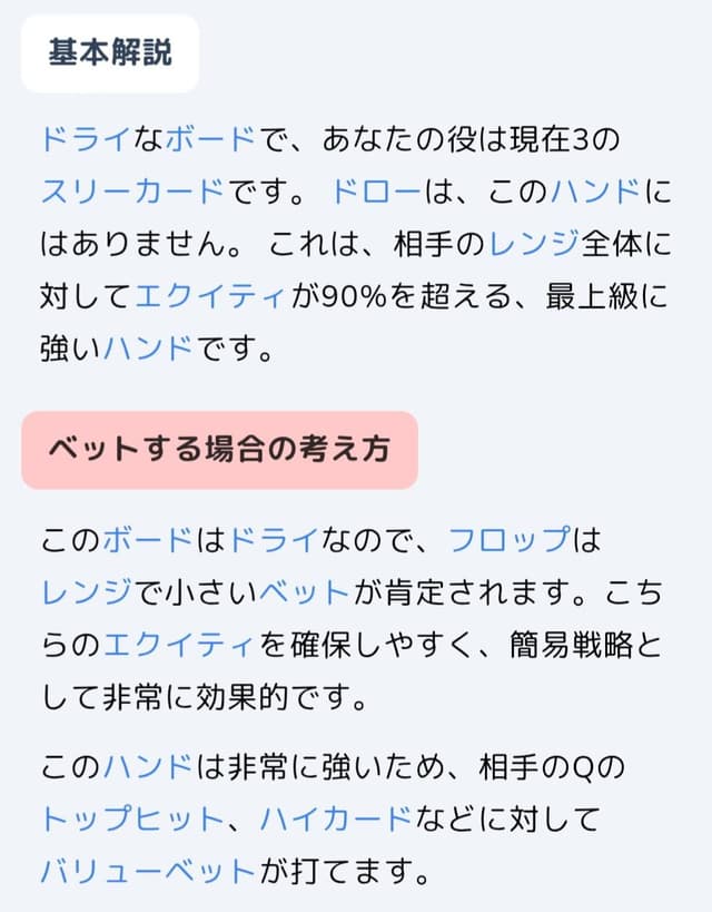 といった点が気になりました。例えば、ガットショット+フラッシュドローのような実戦上かなり強いドローハンドが、ボードのペアを優先して「ワンペア」と表示されるなど、実戦感覚と明らかにズレた分類も見受けられました。