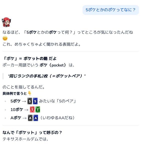 こうしたミスは単なる最適化のズレではなく、プレイヤーの理解を誤った方向に導いてしまう可能性があるという点で、学習ツールとしてはかなり致命的です。ポーカーAIにおいては、「強い」以前に 「明確に間違えない」ことの方が重要だと感じました。最低限の戦略整合性が担保されていないと、ユーザーは安心してAIを参考にできません。