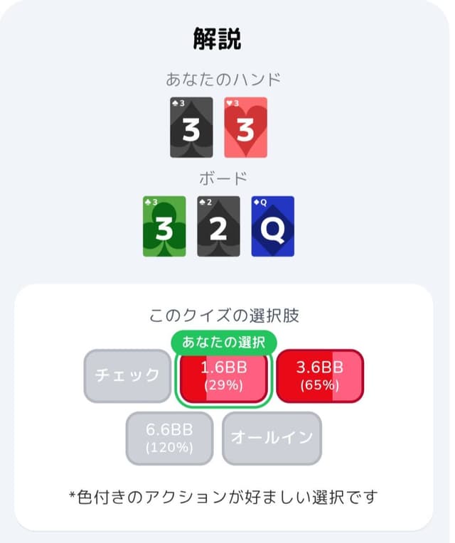 一部のスポットでは、明らかに理論とかけ離れたアクションが推奨されるケースも見られました。例えば、「完成したストレートをフォールドすることが推奨」と表示されるなど、実戦上ほぼあり得ない判断が提示される場面がありました。