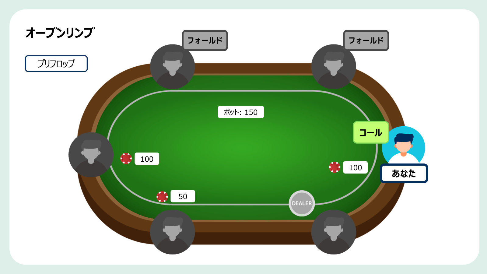 プリフロップでまだ誰も参加していない状況で、自分が参加したいとき、レイズだけでなく、コールというアクションをすることもできます。これは「オープンリンプ」とよばれます。