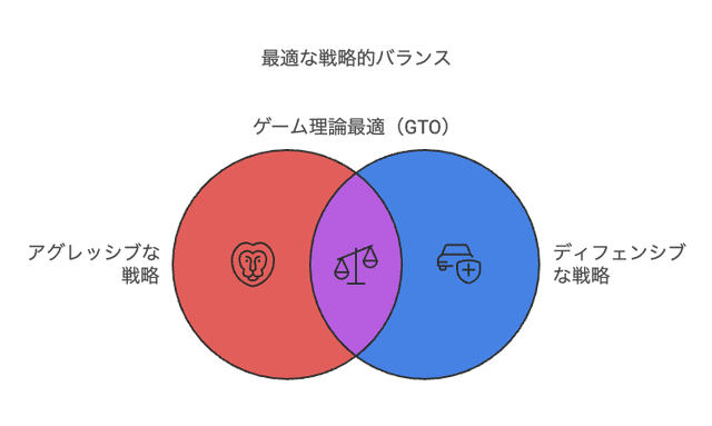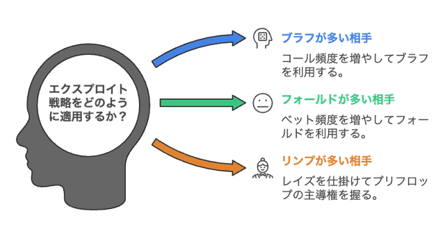 - エクスプロイト戦略: 相手の弱点を見抜き、相手が理論的に正しいプレイから外れた場合に、それを最大限に利用して利益を得る。