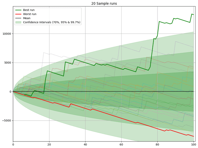 例えば、参加費100$・参加人数100人のトーナメントを、「本来の実力が収支プラマイ0の人」が100回プレイした時の成績シミュレーションをしてみましょう。すると、以下のような結果になります。