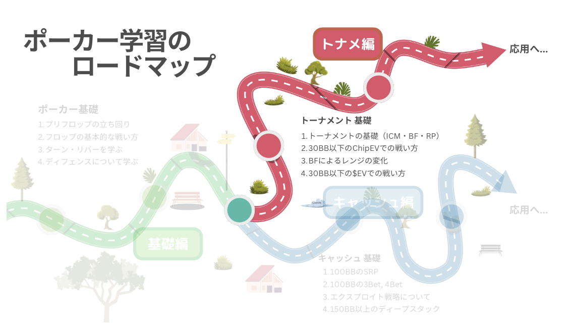 トーナメントは順位によって賞金が決まるというルールのため、トーナメント特有の知識を身につける必要がなります。次のような順番で学習していくのがよいでしょう。