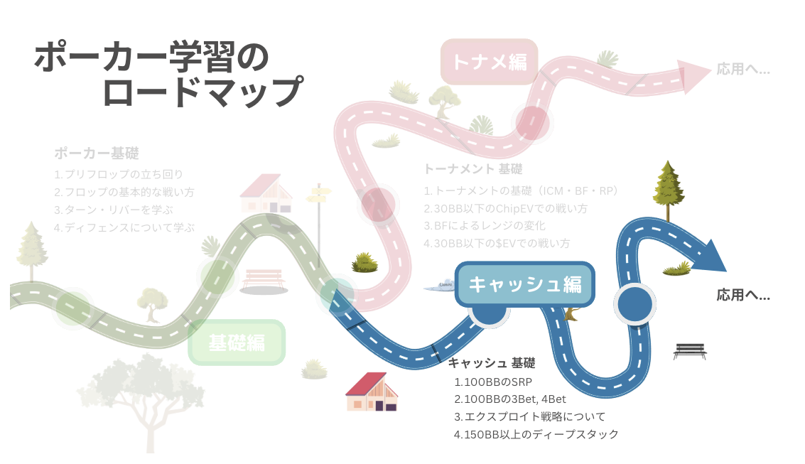 ポーカーのルールは覚えたけど、何を勉強したらキャッシュゲーム・トーナメントが強くなれるのか分からない……そんな方に向けて、この記事では「何をどの順序で学べば効率的に強くなれるか」を明確にした学習ロードマップを紹介します。このロードマップに沿って学べば、キャッシュゲームとトーナメント、自分の好みに合わせて方向性を間違えずに上達できます!