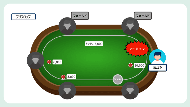 - スタックが浅くなるトーナメントではオールインが重要