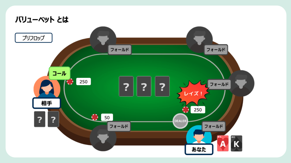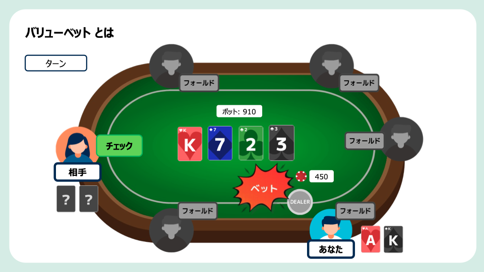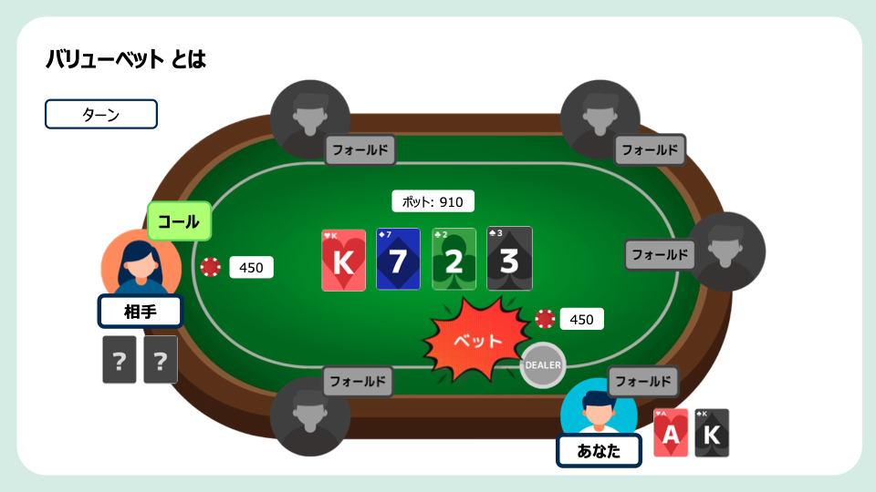 - バリューベットは、「相手より強いハンドを持っていると判断できる状況で、相手からコールを引き出しポットを大きくするベット」 のことです。